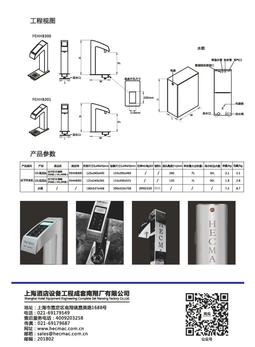 10L高龙头 产品尺寸:125*240*400mm, 包装尺寸:155*300*460mm。 龙头高度:260mm, 单次最大出水量7L,每小时出水量30L 配置水箱:水箱产品尺寸180*537*468mm,包装尺寸290*553*700mm。功率/电压:2KW/200V,容积10.5L。