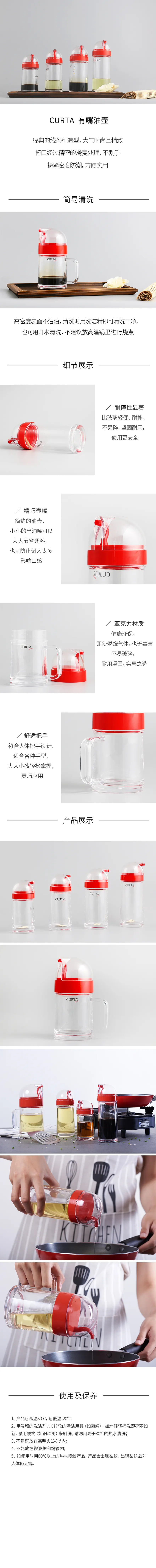 特别弯嘴设计,倾倒时流量均匀;100%避免滴漏现象,适合盛放油制品;手指流量控制,用量控制非常精确和方便;优质硅胶密封圈,优良密封效果;使用后可套上透明圆盖,卫生美观