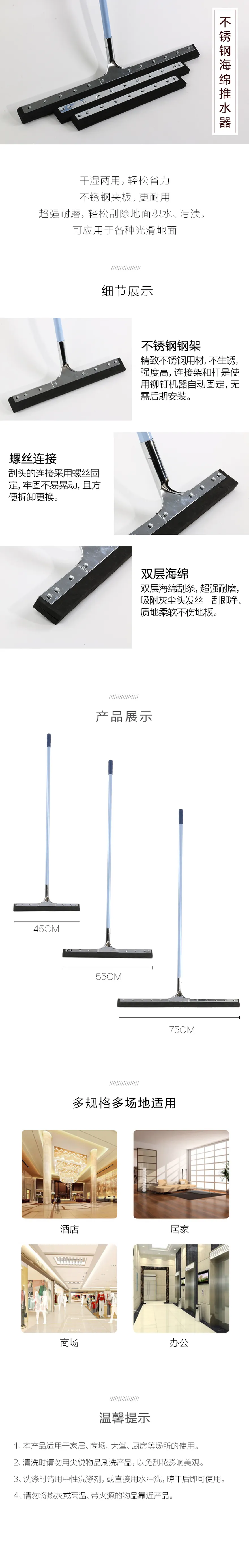 钢绵胶条+铝合金推杆;富有柔韧性的黑色海绵条,具有良好的吸水性;可与地面完全接触,不平整地面也能清理干净